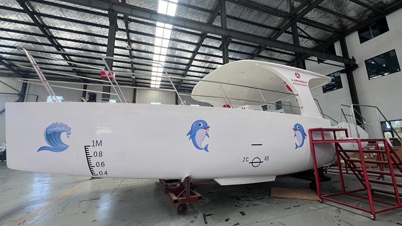 DeLawada®10,28m seglingskatamaran utrustad med två uppsättningar 6kw elektriska framdrivningssystem. Dettabåtomdefinierar konceptet med miljövänliga seglingskatamaraner genom att erbjuda nollutsläppsprestanda, bra energieffektivitet och avsevärd minskning av driftskostnader, i linje med den globala förändringen mot hållbara marina transportmetoder.